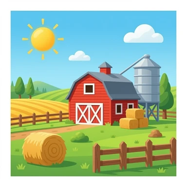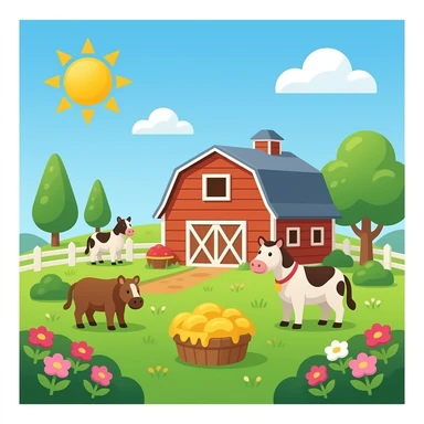 Farm animals inside barn Cow, pig, rooster, dog, duck, cat, chicken, sheep, goat, mouse, rabbit, Turkey, owl, donkey, horse, and llama in the barn emoji