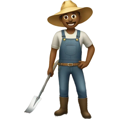 A 3D cartoon farmer standing in a green field with crops, wearing a hat and holding a shovel, bright sunlight, soft shadows, realistic Memoji-style rendering. emoji