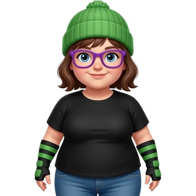 fat 12 year old girl with a green beanie with purple glasses on it, wearing green and black armbands a black shirt and ugly jeans emoji