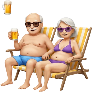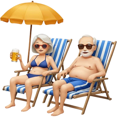 an emoji that shows elderly one slim woman in bikini and one man with dickbauch in bath shorts, both are retired and are lying in sun-chairs at the beach to recover from retiring-stress emoji