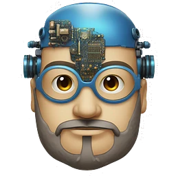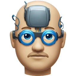 Fat bald cyborg head with blue steampunk goggles, brown beard and circuits emoji | AI Emoji Generator