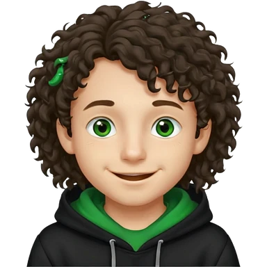 boy with long curly hair and a mole next to his mouth with green eyes black hoodie smiling emoji