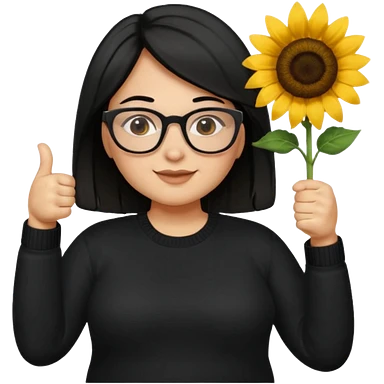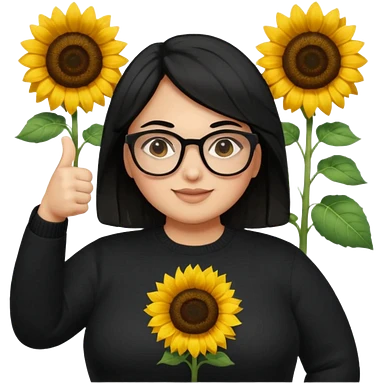 Make my biology teacher shes light brown, wears glasses, female, fat, all black sweater down and sunflower shirt under and make her give 1 thumbs up and she has black hair and chubby emoji