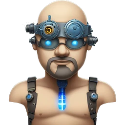 Fat cyborg head with blue steampunk goggles, brown beard and circuits emoji | AI Emoji Generator