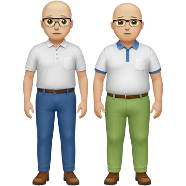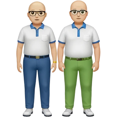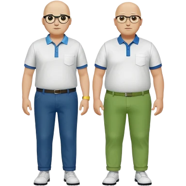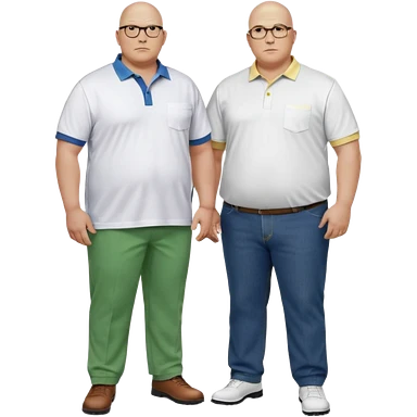 two guys, the first guy is white bald have glases a white dressshirt with rolled up sleeves and green pants he is over weight, The second guy has a yellow skin white golf shirt blue jeans and bald they should stand next to eachother they are both really fat emoji