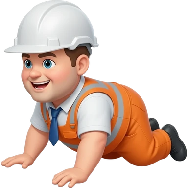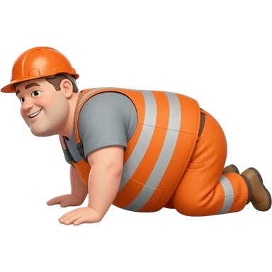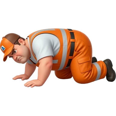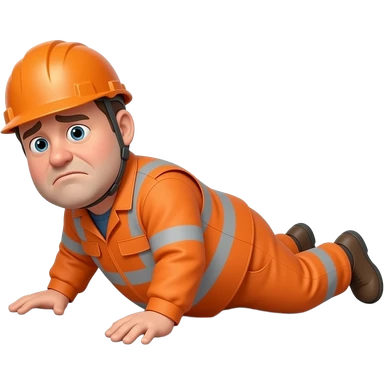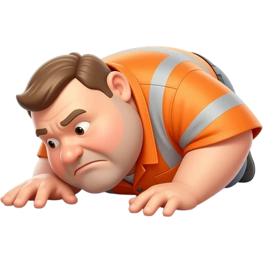 fat MAN, no helmet, IN ORANGE HIVIS OVERALLS, not happy, laying face down on floor, side view emoji