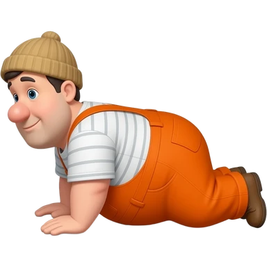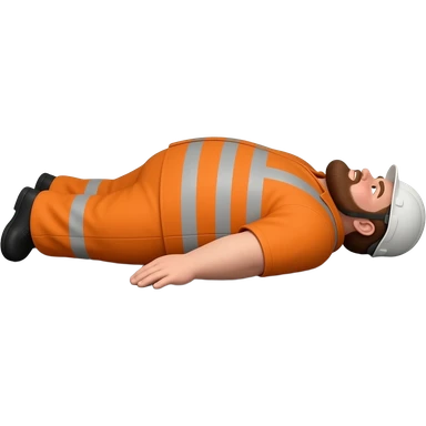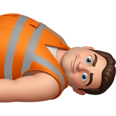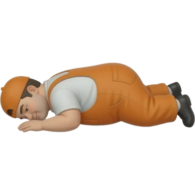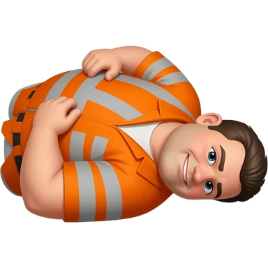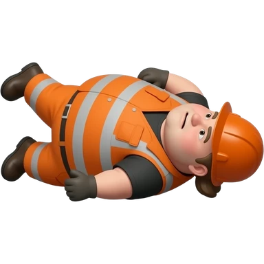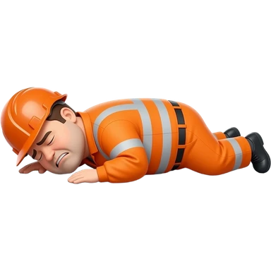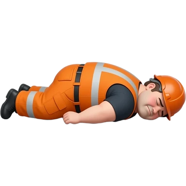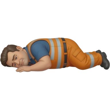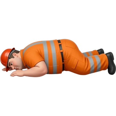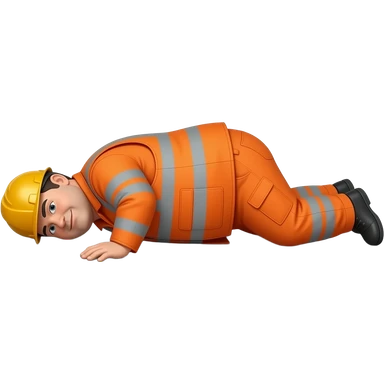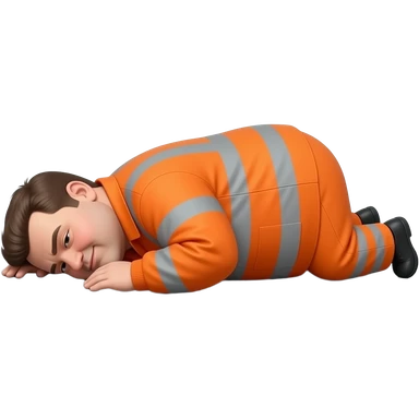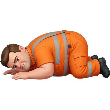 fat MAN IN ORANGE HIVIS OVERALLS, no helmet, not smiling, laying face down on floor, side view emoji