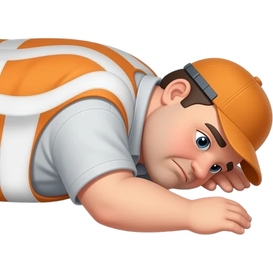 fat MAN, no hat, IN ORANGE HIVIS OVERALLS, not happy, laying face down on floor, side view emoji