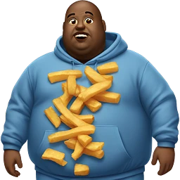 fat man in dirty blue sweatsuit with chili cheese fries in his mouth emoji