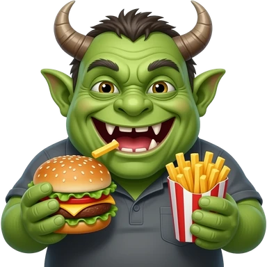 Fat goblin eating junk food with rotten teeth and smiling emoji