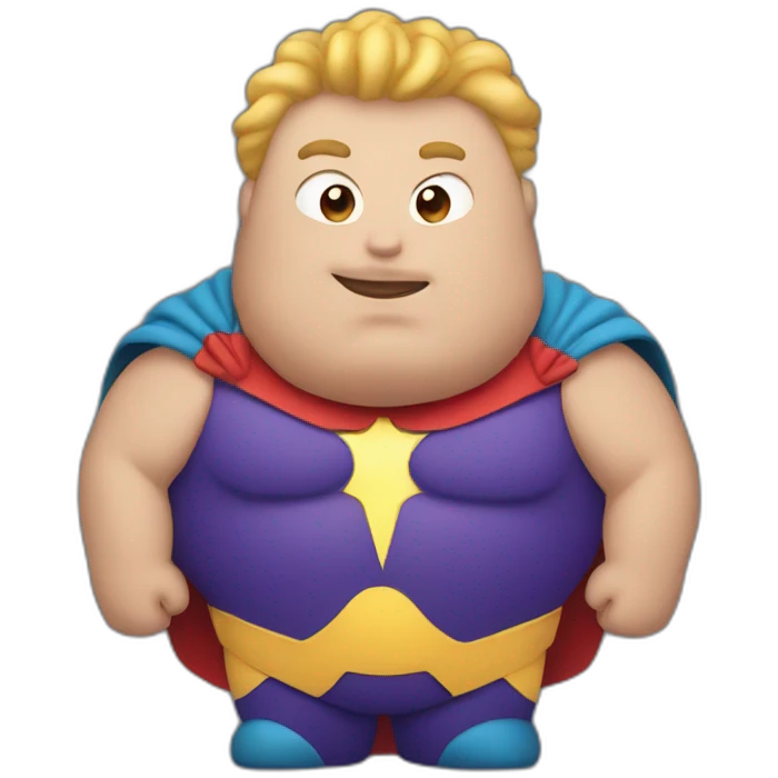 fat man with dark hair,a vibrant long yellow jacket, pink glasses, short jeans shorts. Show full lenght peson, person fighting a monster as superhero emoji