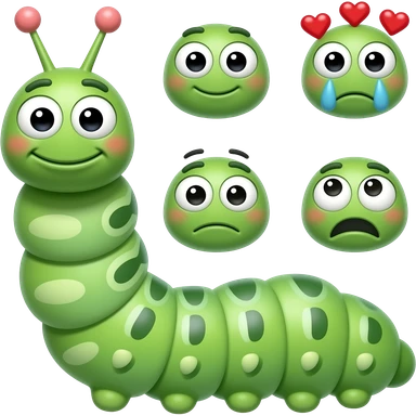 Cinematic Cute Caterpillar Portrait Emoji, Head tilted playfully and inquisitively, featuring a small, fuzzy body with rounded, plump segments, soft, endearing eyes and a charmingly wiggly movement, Simplified yet irresistibly adorable features, highly detailed, glowing with a warm, inviting green glow, high shine, affectionate and lively, stylized with a touch of whimsical woodland charm, soft glowing outline, capturing the essence of a mischievous caterpillar that seems as if it could crawl out of the screen into your arms! emoji