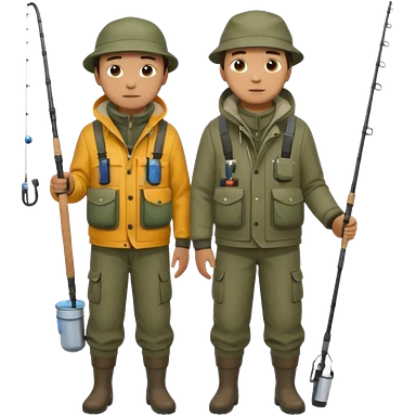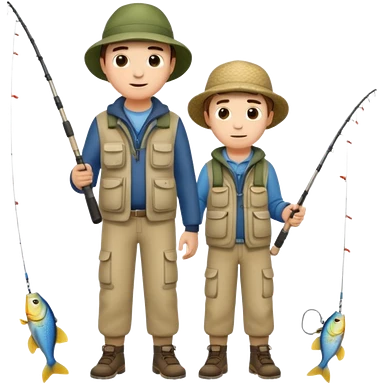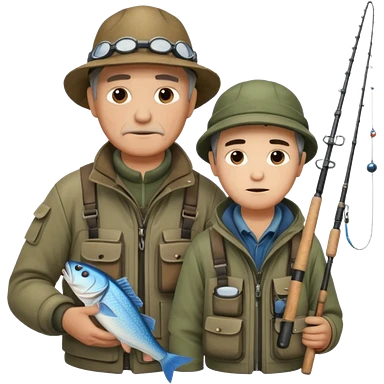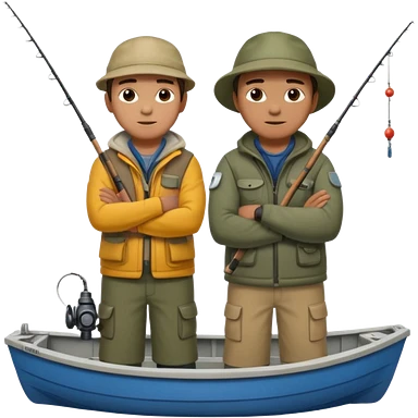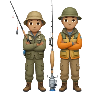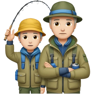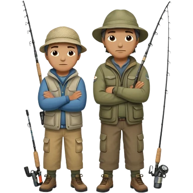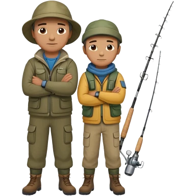 Father and son in fishing gear, arms crossed because they are cold full body emoji