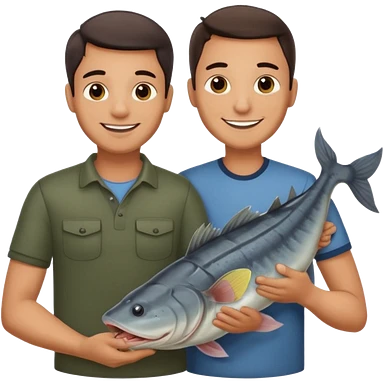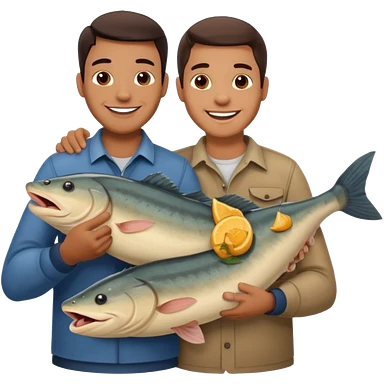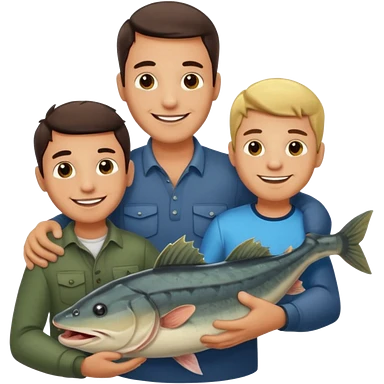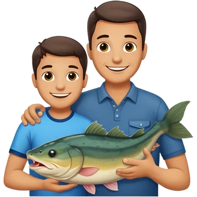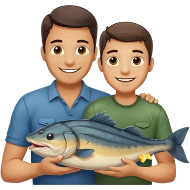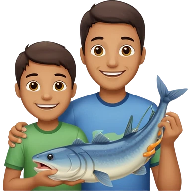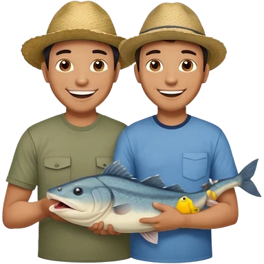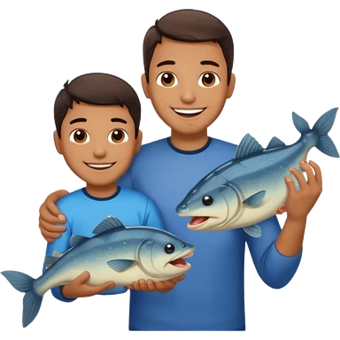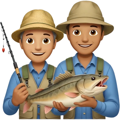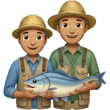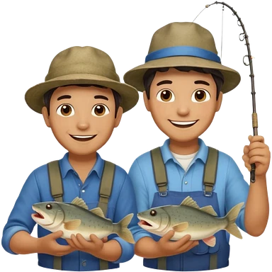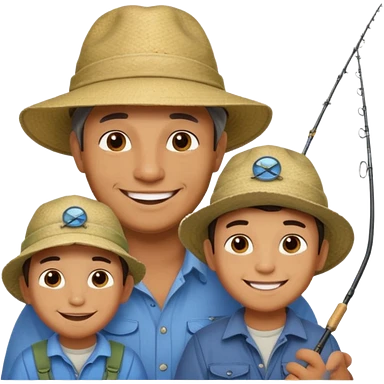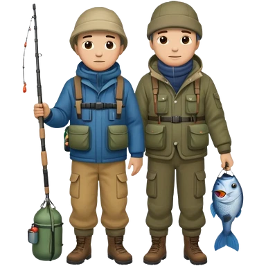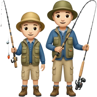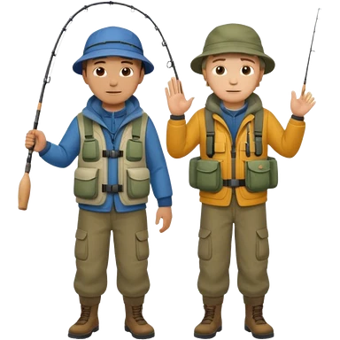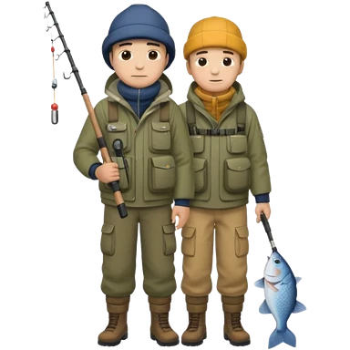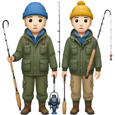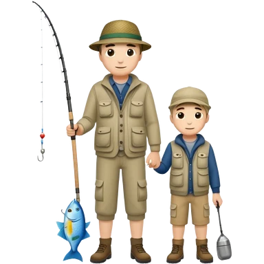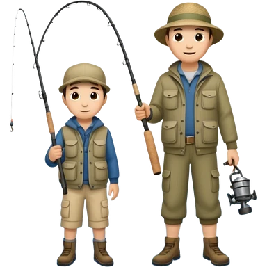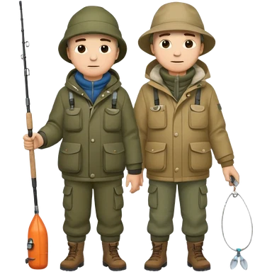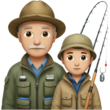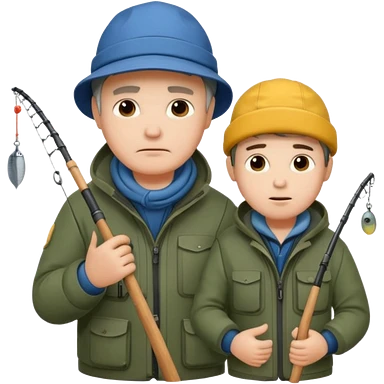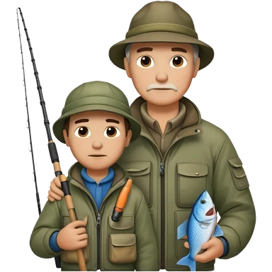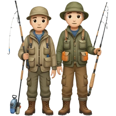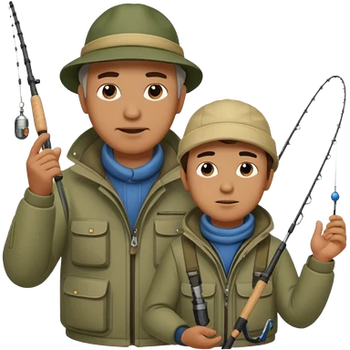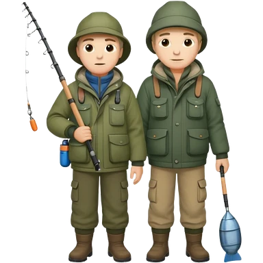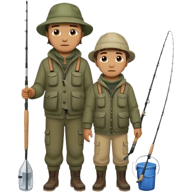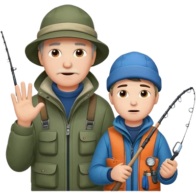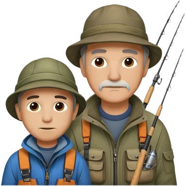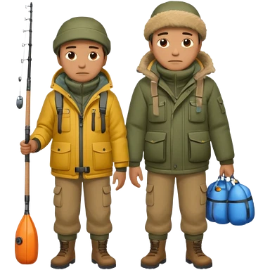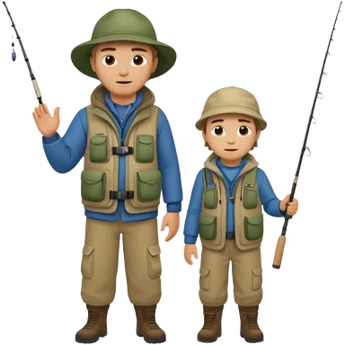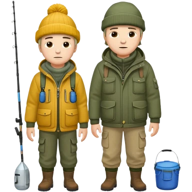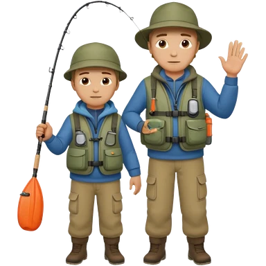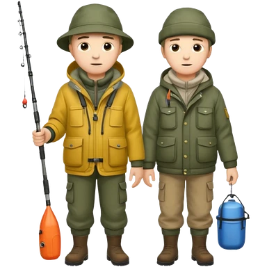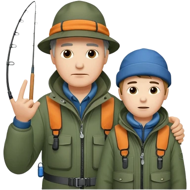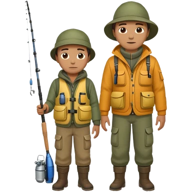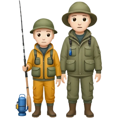 Father and son in fishing gear gesturing that they are cold, full body emoji