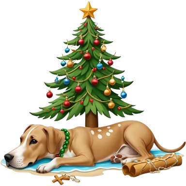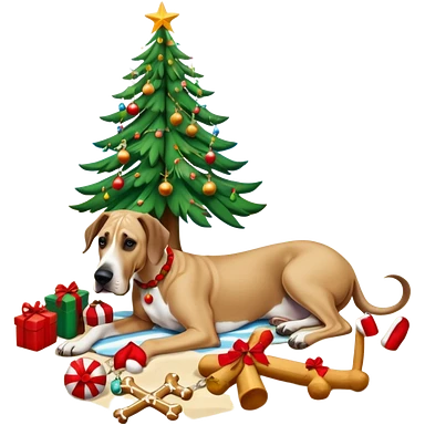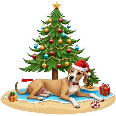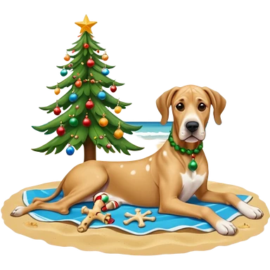 Fawn Great Dane laying on a tropical beach with a Christmas tree and dog bones under the tree emoji