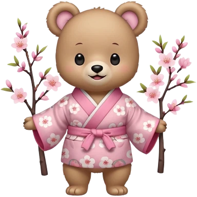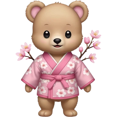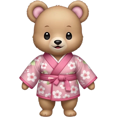 A cute baby bear character in pastel style, standing upright like a human. Light brown soft fur, large round ears, rounded paws and feet. Big cute black dot eyes, medium blush cheeks, and a tiny smiling mouth. Wearing a pink kimono with soft cherry blossom patterns on the sleeves and bottom, emoji