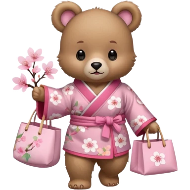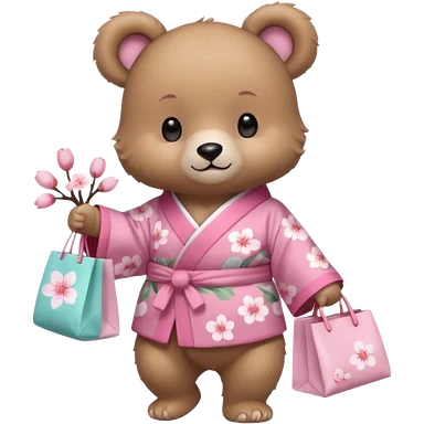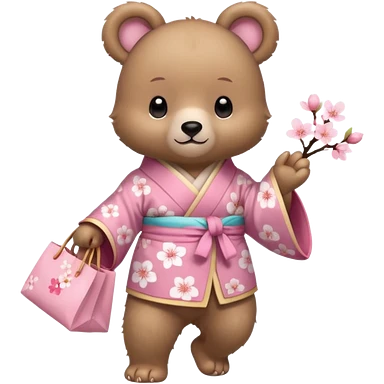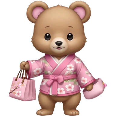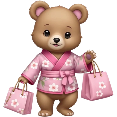 A cute baby bear character in pastel style, standing upright like a human. Light brown soft fur, large round ears, rounded paws and feet. Wearing a pink kimono with soft cherry blossom patterns on the sleeves and bottom, Holding a cute pastel shopping bag with one paw, walking pose. emoji