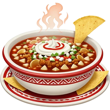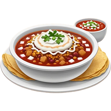 a hot bowl of pozole with a side of tostada with sour cream and red salsa emoji