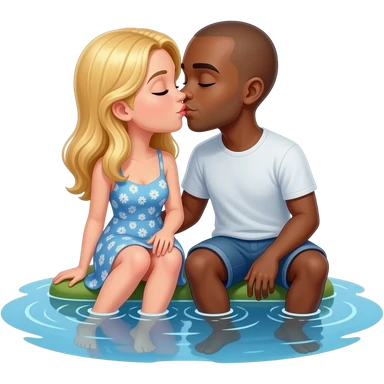 Blonde woman with black bald boyfriend sitting on a lake with feet in the water kissing emoji