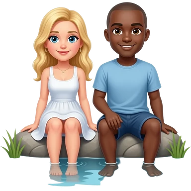 Blonde woman with black bald boyfriend sitting on a lake with feet in the water emoji