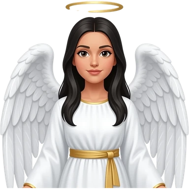 Female Hispanic angel with long straight black hair wearing a long white tunic with a gold sash on it emoji