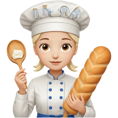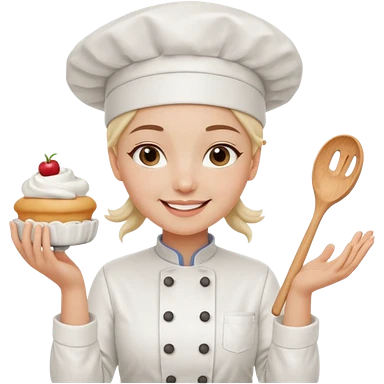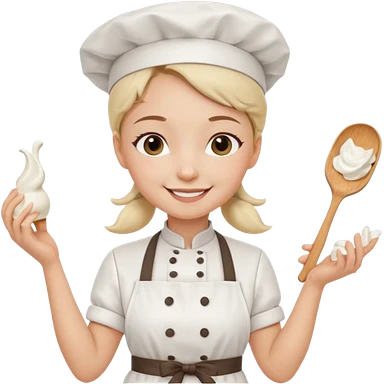 Young female baker – wearing white chef hat, holding a piping bag with cream emoji