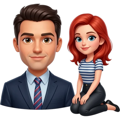 Female redhead on her knees in front of dark haired. male emoji