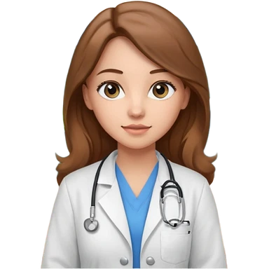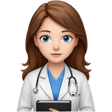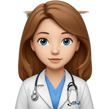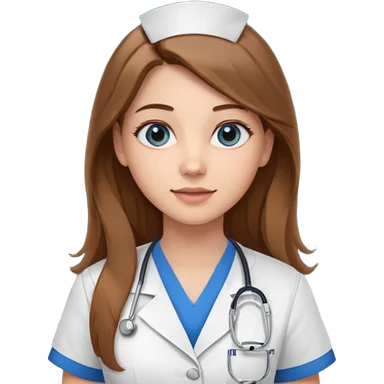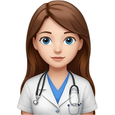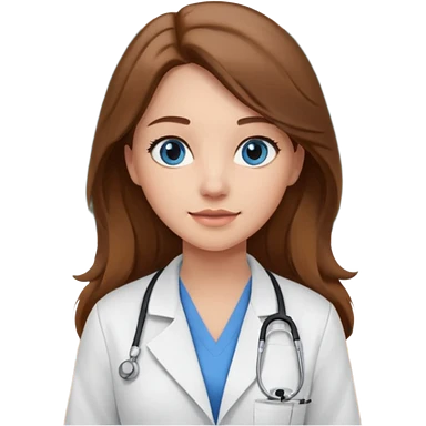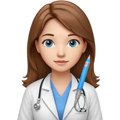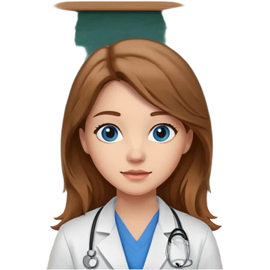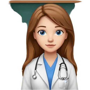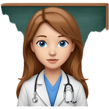 pretty female nursing student with long brown hair, blue eyes inside a classroom at university with blackboard behind her emoji