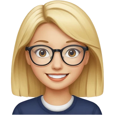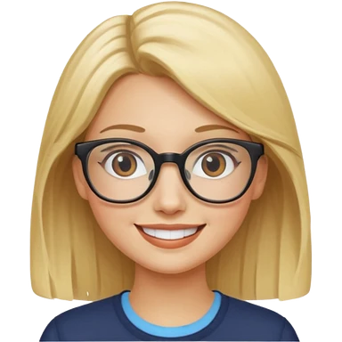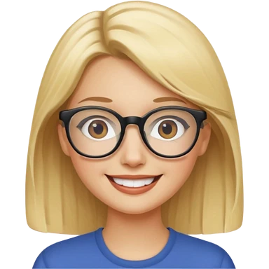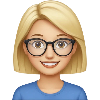 female teacher, long black hair with some grey, wearing blue eyeglasses. Brown eyes. Wering a polo shirt. Smiling emoji