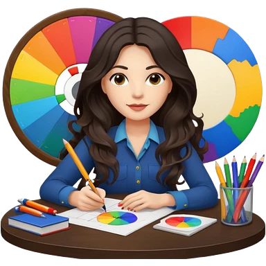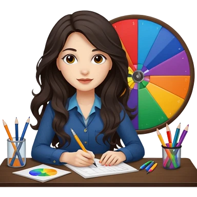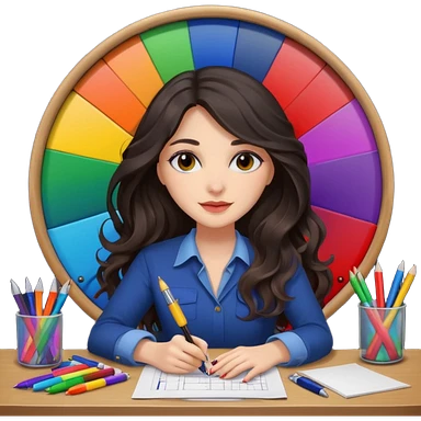 female dark wavy long hair graphic designer , color wheel, pens, papers , desktop emoji | AI Emoji Generator