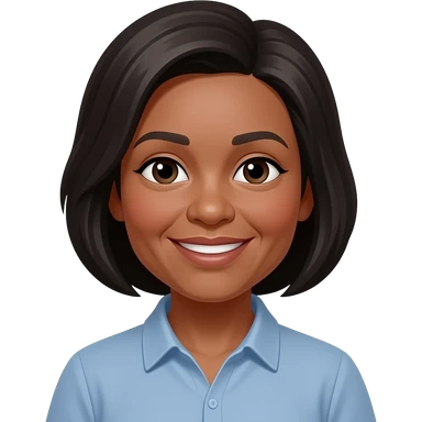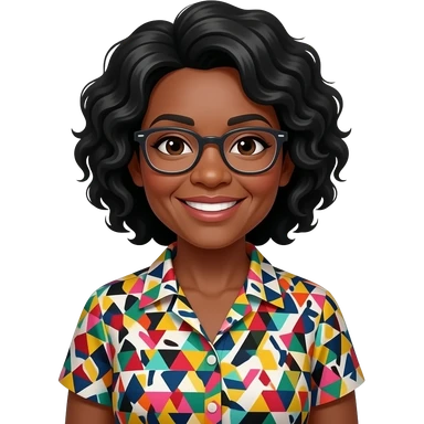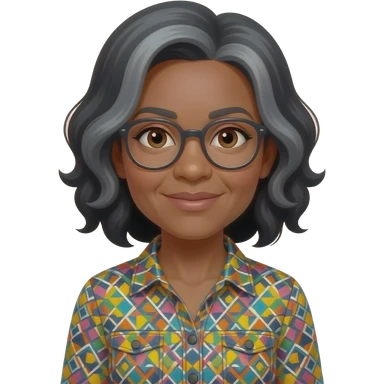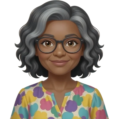 female, early 60s, round face, african decent, colourful blowse top, grey and black wavy hair, remove glasses emoji