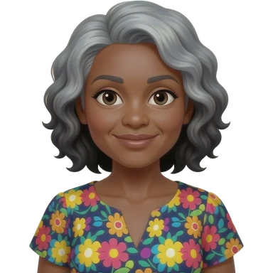 female, early 60s, round face, african decent, colourful blowse top, grey and black wavy hair emoji