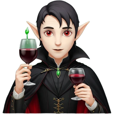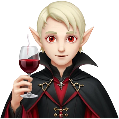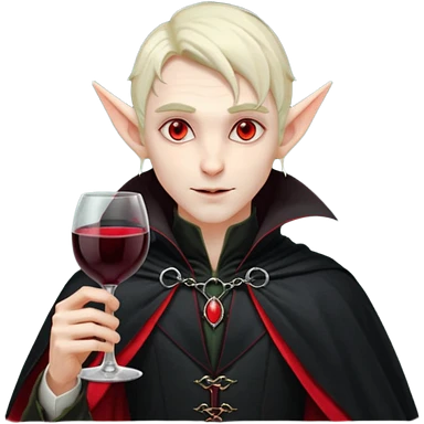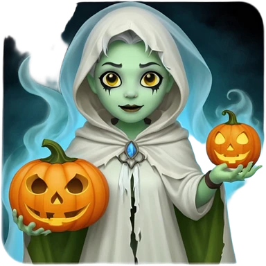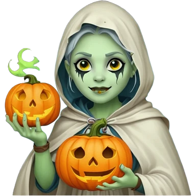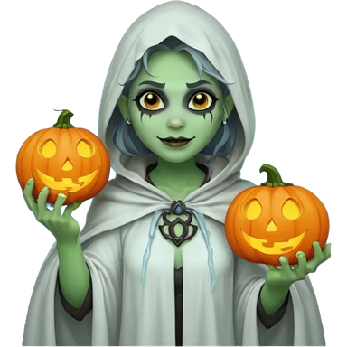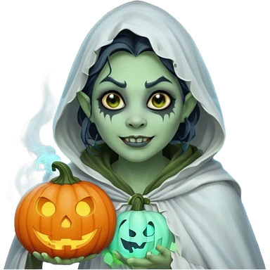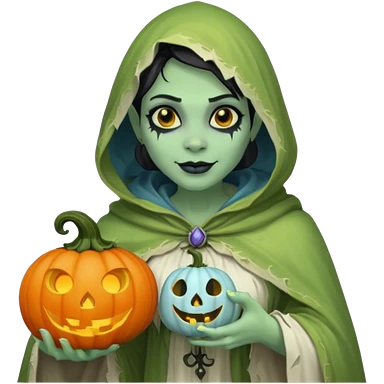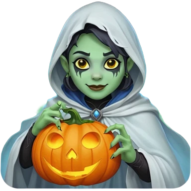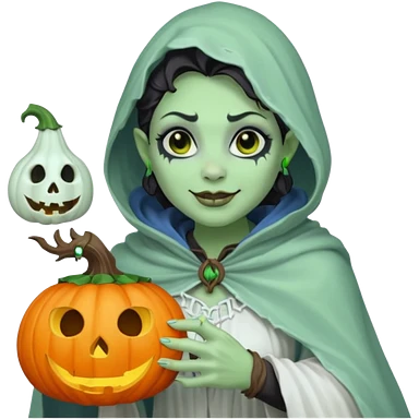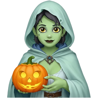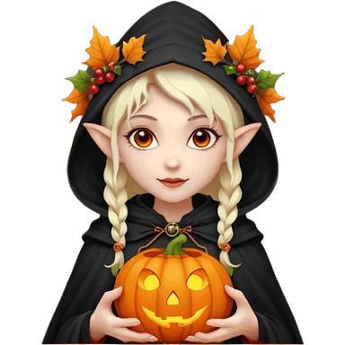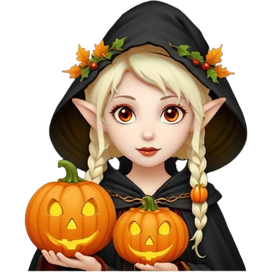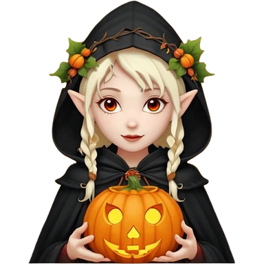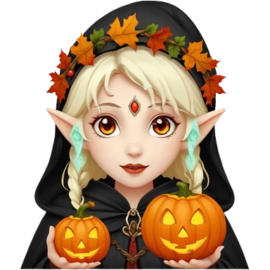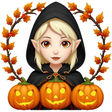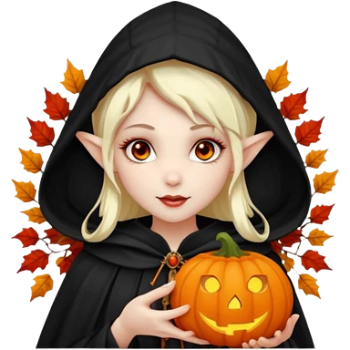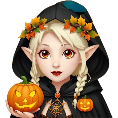 female elf vampire emoji, pale skin, red eyes, elegant face, autumn leaf and pumpkin wreath on head, black hooded cloak with cobweb details, holding small glowing pumpkin lantern, Halloween fantasy theme, Apple emoji style, clean white background, squareemoji