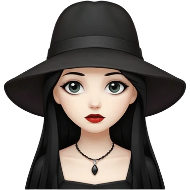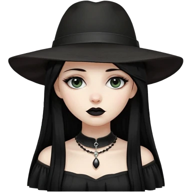 Female Goth with Wide-Brim Hat Long straight black hair, white skin, black dress, wide hat casting shadow over eyes. emoji | AI Emoji Generator