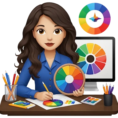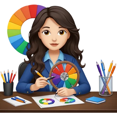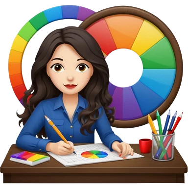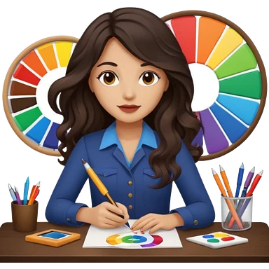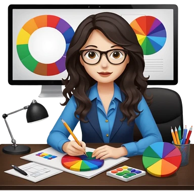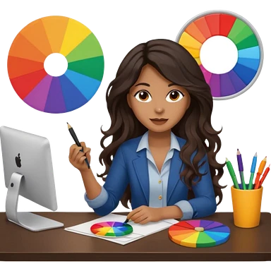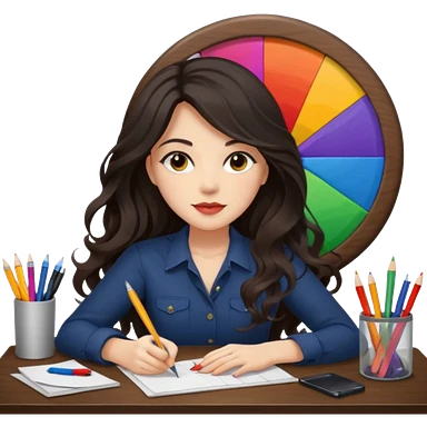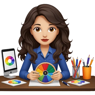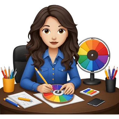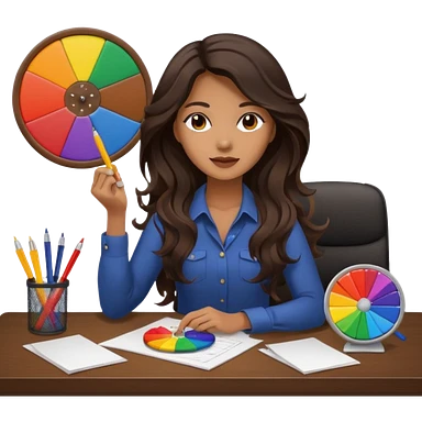 female dark wavy long hair graphic designer , color wheel, pens, papers emoji