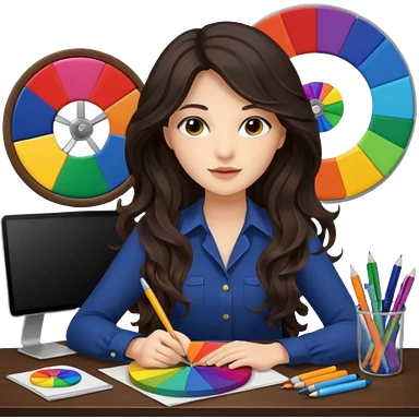 female dark wavy long hair graphic designer , big color wheel behind , pens, papers, desktop emoji