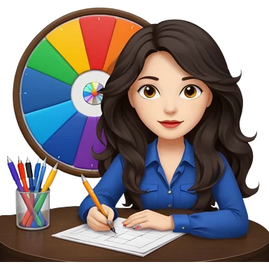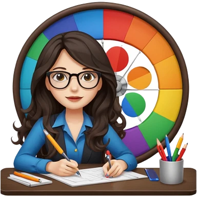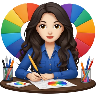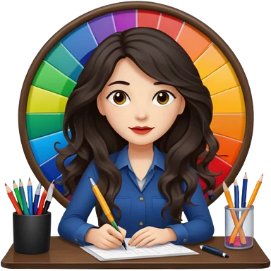 female dark wavy long hair graphic designer , big color wheel behind , pens, papers, desktop emoji