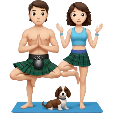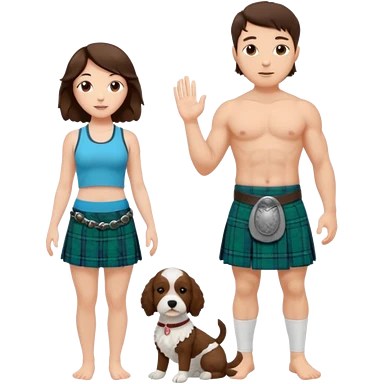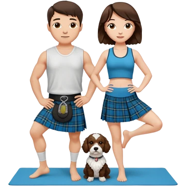 emoji of brunette man wearing kilt, brunette woman in yoga outfit and white cockapoo emoji