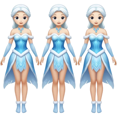 Four images of the same ice Snow Maiden character with two arms and two legs: front view, back view, side view, three-quarter view. Full body, translucent ice, winter fairy tale style, consistent design, clean anatomy. emoji