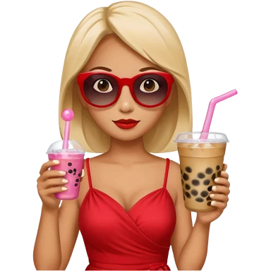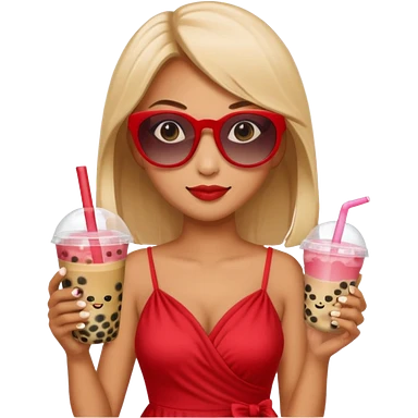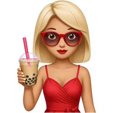 Female in red dress, holding bubble tea, wearing sunglasses emoji