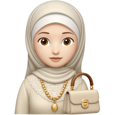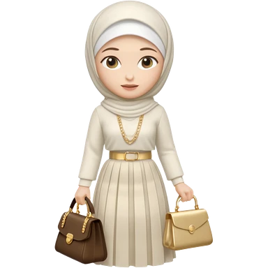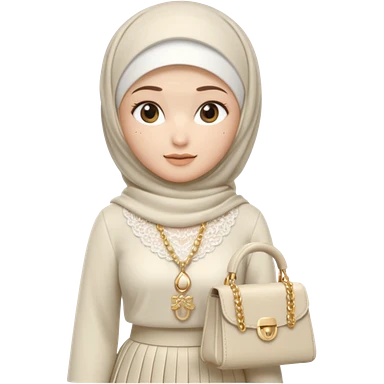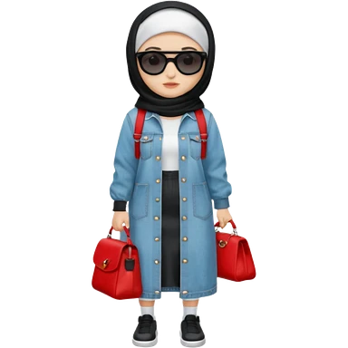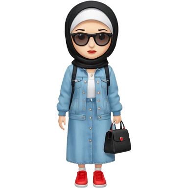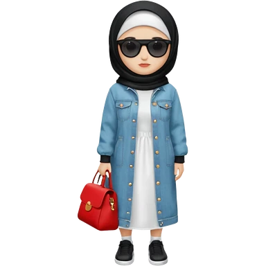 female memoji character, iPhone style, wearing black hijab, white long dress, oversized light blue denim jacket, white socks, black shoes with red detail, black shoulder bag, sunglasses on head, cute expression, no background, transparent PNG emoji | AI Emoji Generator