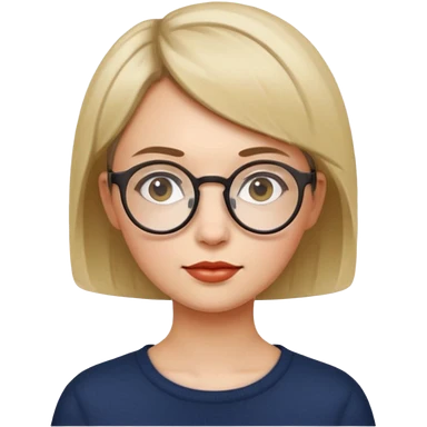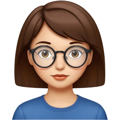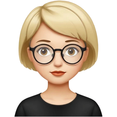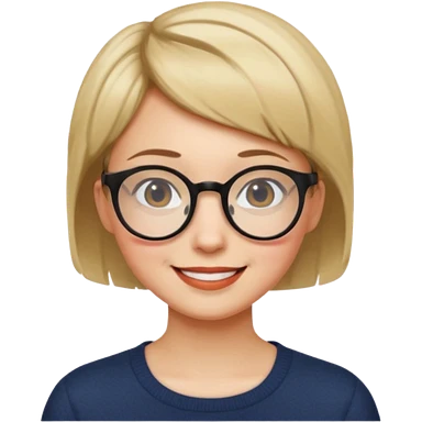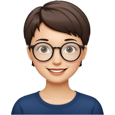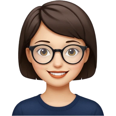 female teacher, long black hair with some grey, wearing round eyeglasses. Brown eyes. Wearing a polo shirt. Smiling emoji
