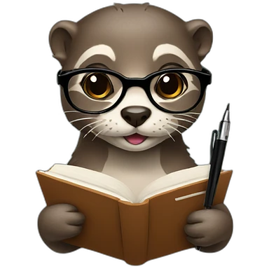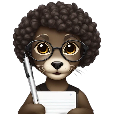 female Otter with round glasses and black curly hair holding a couple journals and a pen emoji