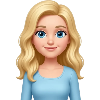 Female Memoji, pale skin, blue eyes, long wavy blonde hair, baby blue long-sleeve fitted top, square neckline. emoji