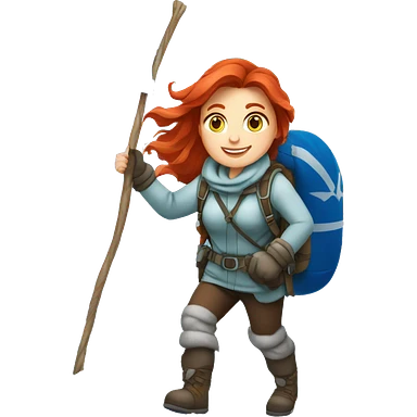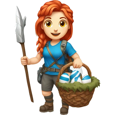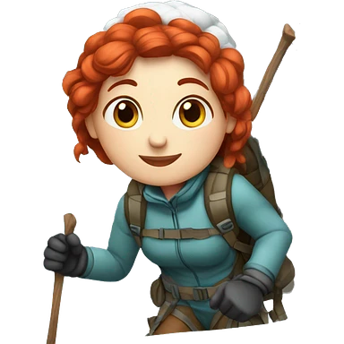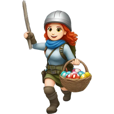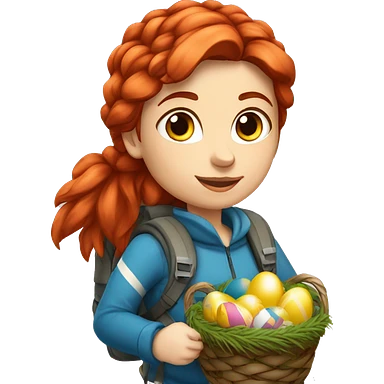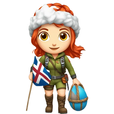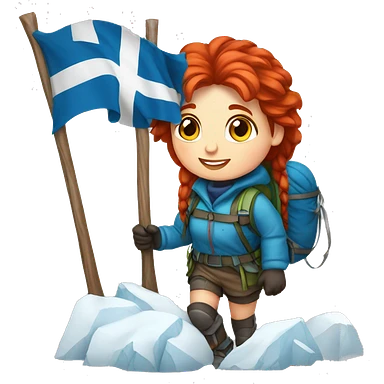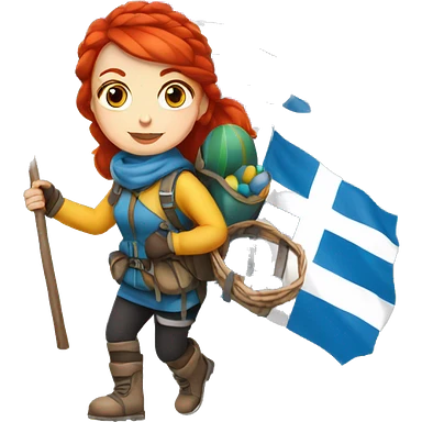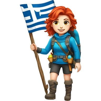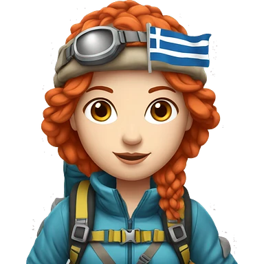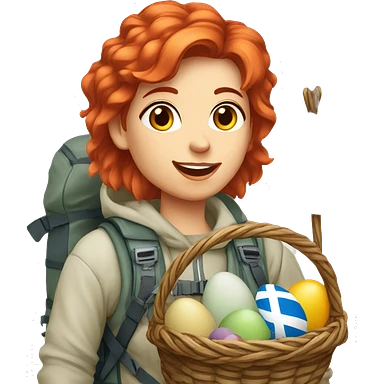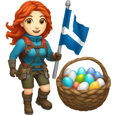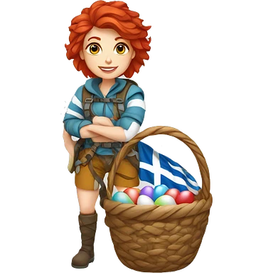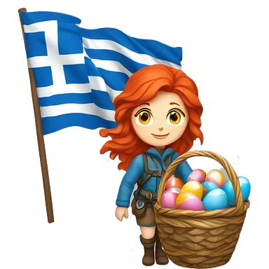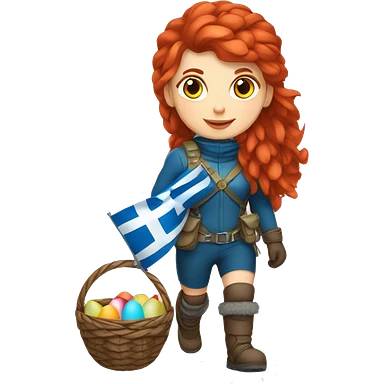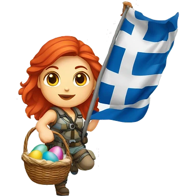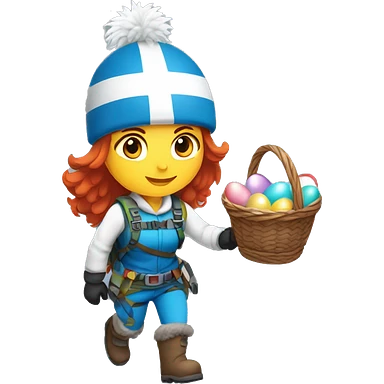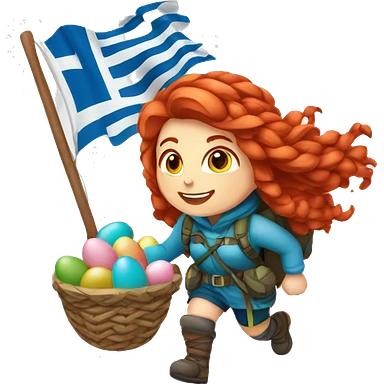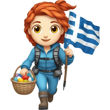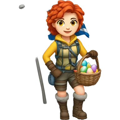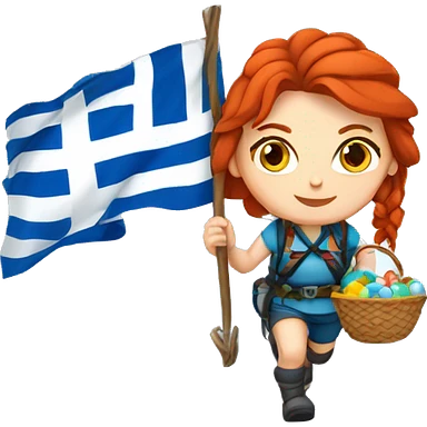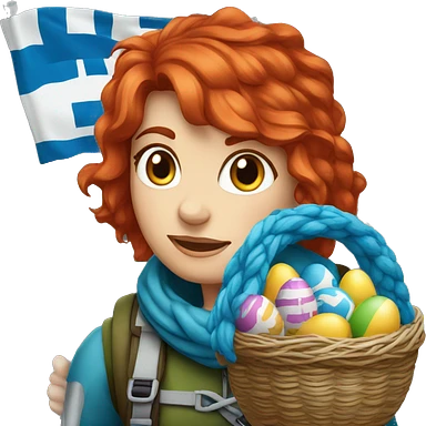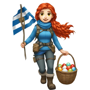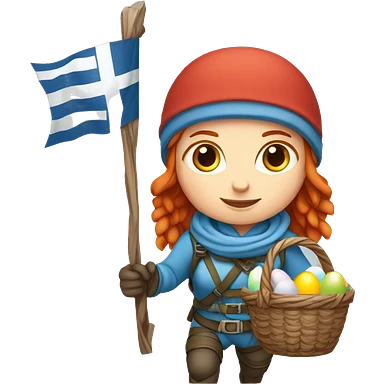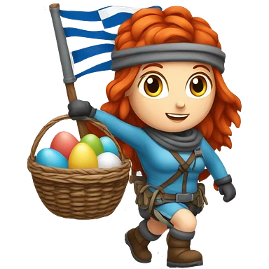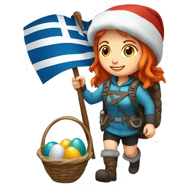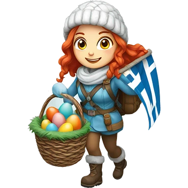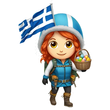 Female winter mountaineer red hair white skin climbing with Greek Flag and Easter eggs basket emoji | AI Emoji Generator