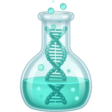 Minimalist flat icon of a glowing laboratory flask with a DNA strand inside and digital data bits floating around it, drug discovery concept, modern biotechnology, clean vector art, teal and white colors, white background. emoji