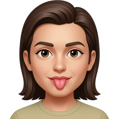 light skin female with dark brown hair. tongue out and hands to the side emoji