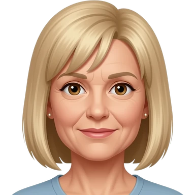 female, 50's blonde straight hair with fringe, earrings, brown eyes emoji