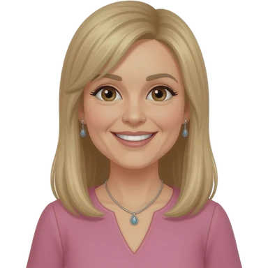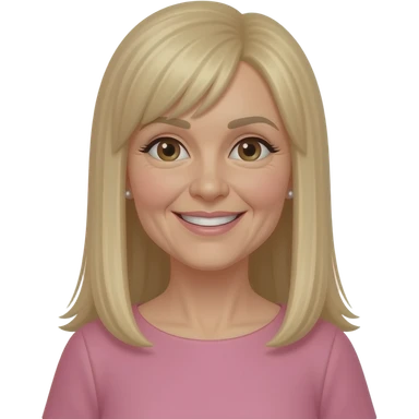 female, 50's, blonde with brown highlights, straight long hair, straight fringe, earrings, brown eyes, pink dress, smile with teeth, neclace emoji