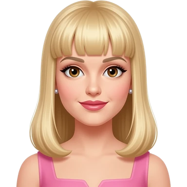 female, 50's blonde straight long hair with straight fringe, earrings, brown eyes, pink dress emoji